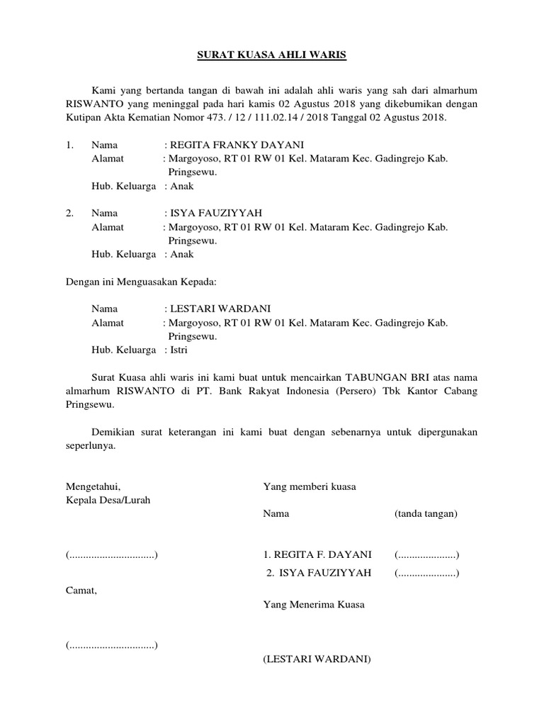 Download Contoh Surat Kuasa Ahli Waris untuk Membagi Harta Warisan. Lihat juga contohturun dan contoh surat kuasa turun waris Wewenang yang dilimpahkan ditetapkan hanya sebatas isi surat kuasa itu. Surat kuasa ini dibuat dengan bahasa yang baku dan jelassurat kuasa ini harus berisikan identitas dan tanda tangan pemberi kuasa dan penerima kuasa dengan benar dan.